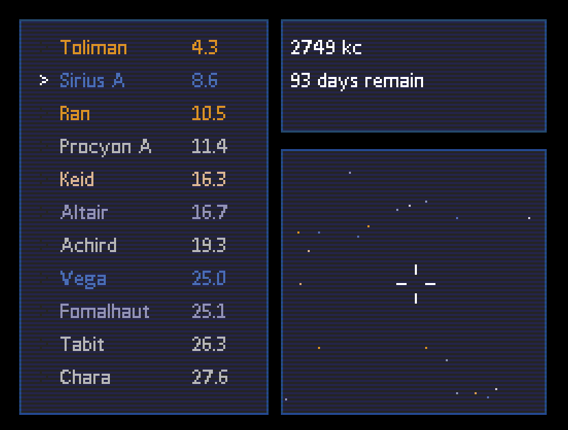 The screenshot is mostly mockup, but the data is pulled from the star data. The star view in the bottom left corner uses polar coordinates, just mapping theta/pi to x/y, which is probably super wrong, but it does everything I want it to: player gets a sense that certain stars are in the same general direction. And quite honestly, who's going to know the difference?