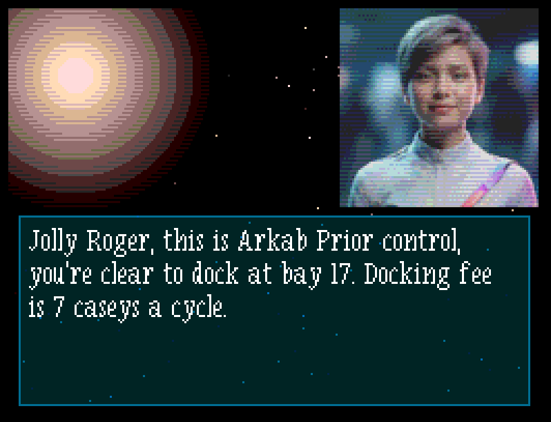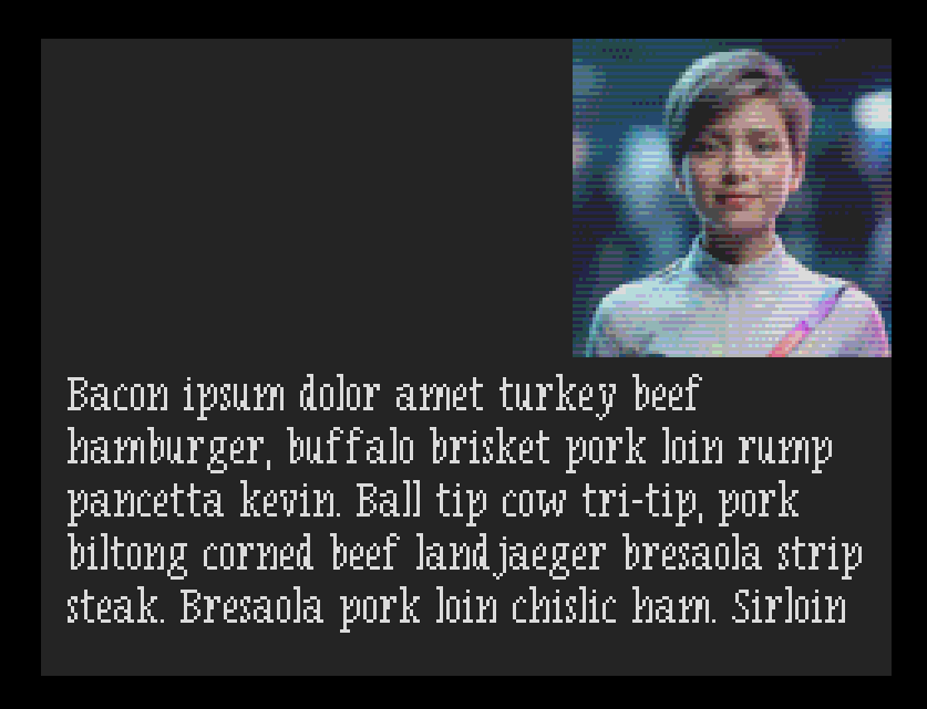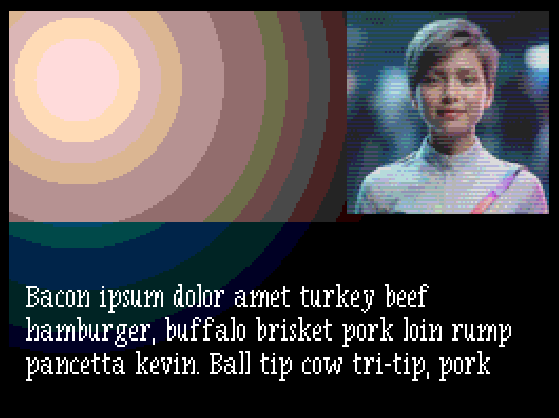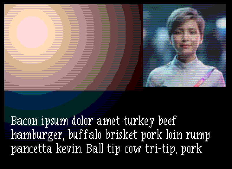 Replaced the circle filling with a brand new bressenham-based filled circle algorithm. I kinda want to do lens flares too which would need some kind of transparent filled disc thing, but didn't get into it yet. I also added the same kind of scanline-y dither as I did with the portraits (although the portraits have way more dithering things going on - I'm not about to implement floyd steinberg on the next).