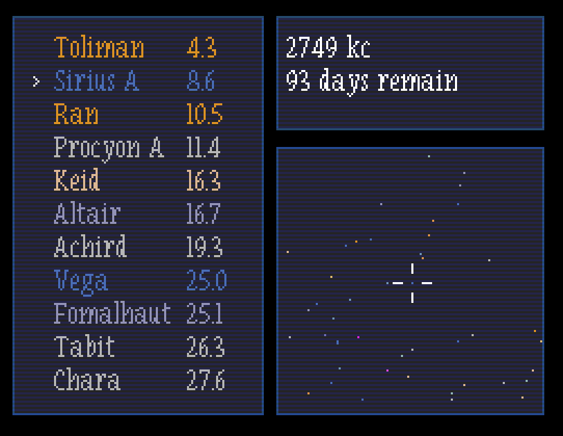 Wrote a little bit of framework code to get some keyboard inputs in, and revamped the navigation screen a bit. The smoothstep I was using to make the starmap a bit dynamic wasn't really working, so I spent some time figuring out a new formula (still using a table lookup so it should(tm) work fine on the next). I'm still not 100% happy with the way it works but it's still better than just doing a plain 2d scroll.