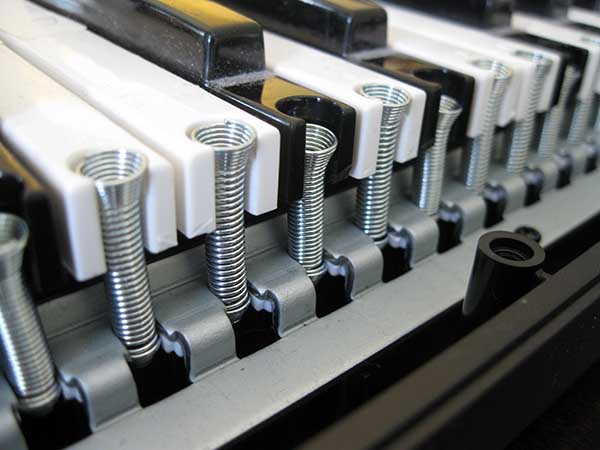 On the back side of the keys you can see a row of springs. These are the squeaky parts. I carefully applied some gun oil to these using a q-tip; I'm pretty sure anything you use to stop your door hinges from squeaking will work just fine. There may be a slight risk of having the oil getting into the electronics here, so I wouldn't horribly overdo the amount of oil used. Not that the oil should do any harm to the electronics, but there's no need to take any chances..