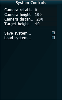 System controls include camera parameters, which are not stored with the particle system. You can also rotate the camera by dragging on the rendering area.